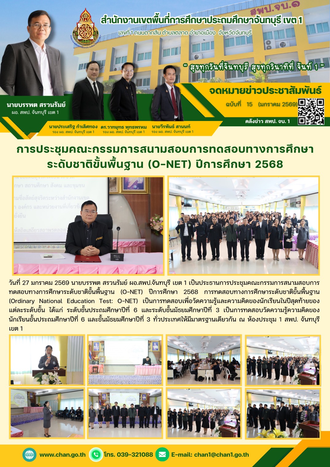 วันที่ 27 มกราคม 2569 นายบรรพต สรวนรัมย์ ผอ.สพป.จันทบุรี เขต 1 เป็นประธานการประชุมคณะกรรมการสนามสอบการทดสอบทางการศึกษาระดับชาติขั้นพื้นฐาน (O-NET) บิการศึกษา 2568 การทดสอบทางการศึกษาระดับชาติขั้นพื้นฐาน (Ordinary National Education Test: O-NET) 1ป็นการทดสอบเพื่อวัดความรู้และความคิดของนักเรียนในปีสุดท้ายของแต่ละระดับชั้น ได้แก่ ระดับชั้นประถมศึกษาปีที่ 6 และระดับชั้นมัธยมศึกษาปีที่ 3 เป็นการทดสอบวัดความรู้ความคิดของนักเรียนชั้นประถมศึกษาปีที่ 6 และชั้นมัธยมศึกษาปีที่ 3 ทั่วประเทศให้มีมาตรฐานเดียวกัน ณ ห้องประชุม 1 สพป. จันทบุรี เขต 1