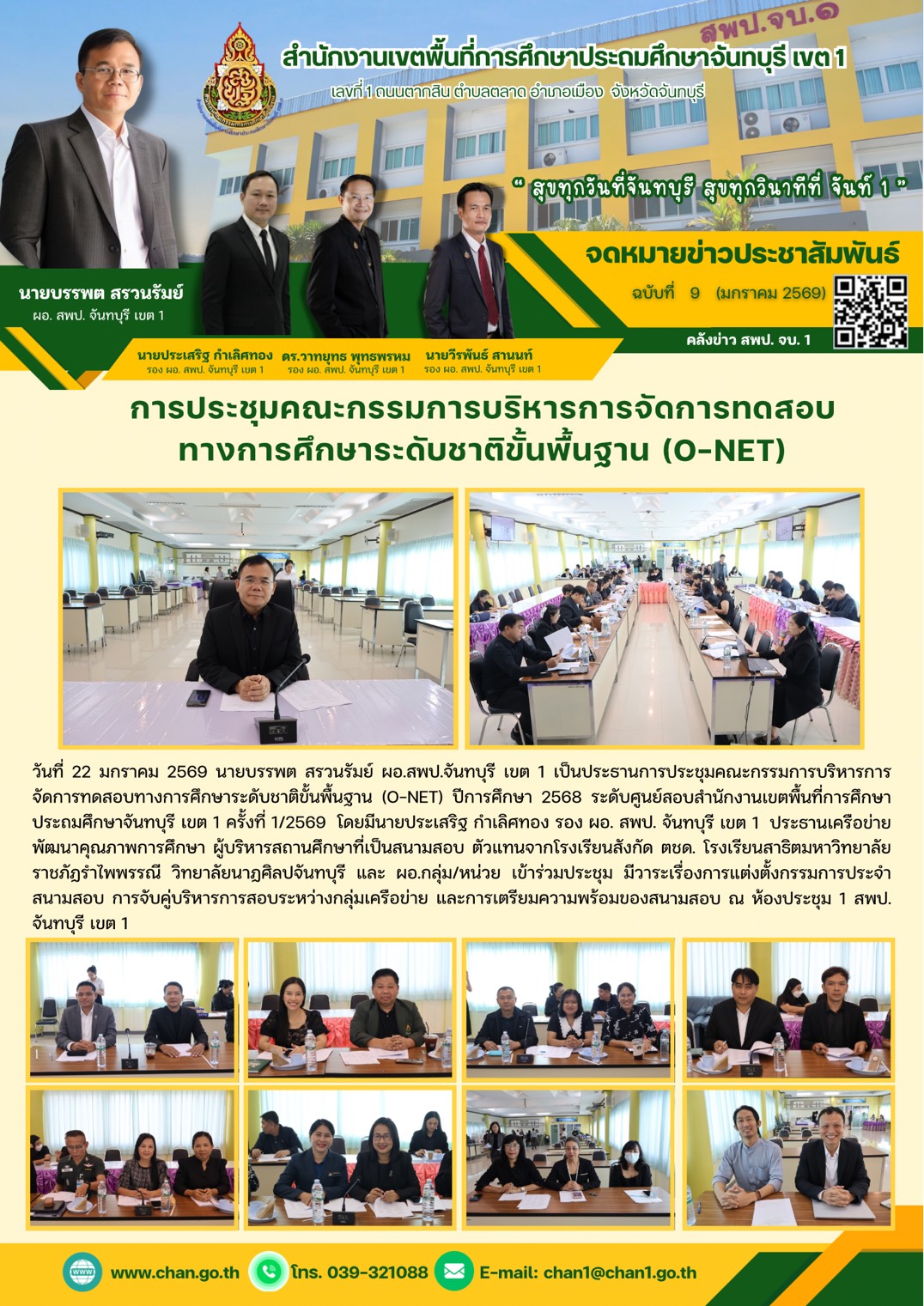 วันที่ 22 มกราคม 2569 นายบรรพต สรวนรัมย์ ผอ.สพป.จันทบุรี เขต 1 เป็นประธานการประชุมคณะกรรมการบริหารการการจัดการทดสอบทางการศึกษาระดับชาติขั้นพื้นฐาน (0-NET) ปีการศึกษา 25668 ระดับศูนย์สอบสำนักงานเบตพื้นที่การศึกษาประถมศึกษาจันทบรี เขต 1 ครั้งที่ 1/2569 โดยมีนายประเสริฐ กำเลิศทอง รอง ผอ. สพป. จันทบุรี เขต 1 ประธานเครือบ่ายพัฒนาคุณภาพการศึกษา ผู้บริหารสถานศึกษาที่เป็นสนามสอบ ตัวแทนจากโรงเรียนสังกัด ตชด. โรงเรียนสาริตมหาวิทยาลัยราชภัฎรำไพพรรณี วิทยาลัยนาฎศิลปจันทบุรี และ ผอ.กลุ่ม/หน่วย เข้าร่วมประชุม มีวาระเรื่องการแต่งกรรมการประจำสนามสอบ การจับคู่บริหารการสอบระหว่างกลุ่มเครือย่าย และการเตรียมความพร้อมของสนามสอบ ณ ห้องประชุม 1 สพป.จันทบุรี เขต 1