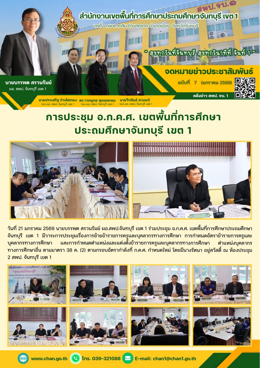 วันที่ 21 มกราคม 2569 นายบรรพต สรวนรัมย์ ผอ.สพป.จันทบุรี เขต 1 ร่วมประชุม อ.ก.ศ. เขตพื้นที่การศึกษาประถมศึกษาจันทบรี เขต 1 มีวาระการประชุมเรื่องการย้ายบ้าราชการครูและบุคลากรทางการศึกษา การกำหนดอัตราข้าราข้าราชการครูและบุคลากรทางการศึกษา และการก้าหนดต่าแหน่งและและแต่งตั้งข้าราชการครและบุคลากรทางการศึกษา ตำแหน่าแหน่งบุคลากรทางการศึกษาอื่น ตามมาตรา 38 ค. (2) ตามกรอบอัตรากำลังที่ ก.ก.ศ.ศ. กำหนดใหม่ โดยมีนางรัตนา อยู่สวัสดิ์ ณ ห้องประขุม 2 สพป. จันทบุรี เขต 1