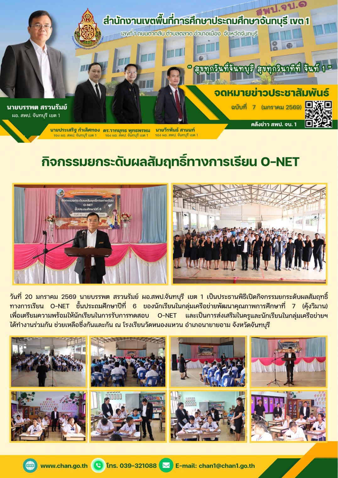 วันที่ 20 มกราคม 2569 นายบรรพต สรวนรัมย์ ผอ.สพป.จันทบุรี เขต 1 เป็นประธานพิธีเปิดกิจกรรมยกระดับผลสัมฤทธิ์ทางการเรียน O-NET ชั้นประถมศึกษาปีที่ 6 ของนักเรียนในกลุ่มเครือย่ายพัฒนาคุณภาพการศึกษาที่ 7 (คังวิมาน) เพื่อเตรียมความพร้อมให้นักเรียนในการรับการทดสอบ O-NET และเป็นการส่งเสริมในครและนักเรียนในกลุ่มเครือบ่ายฯ ได้ทำงานร่วมกัน ช่วยเหลือซึ่งกันและกัน ณ โรงเรียนวัดหนองแหวน อำเภอนายายอาม จังหวัดจันทบุรี