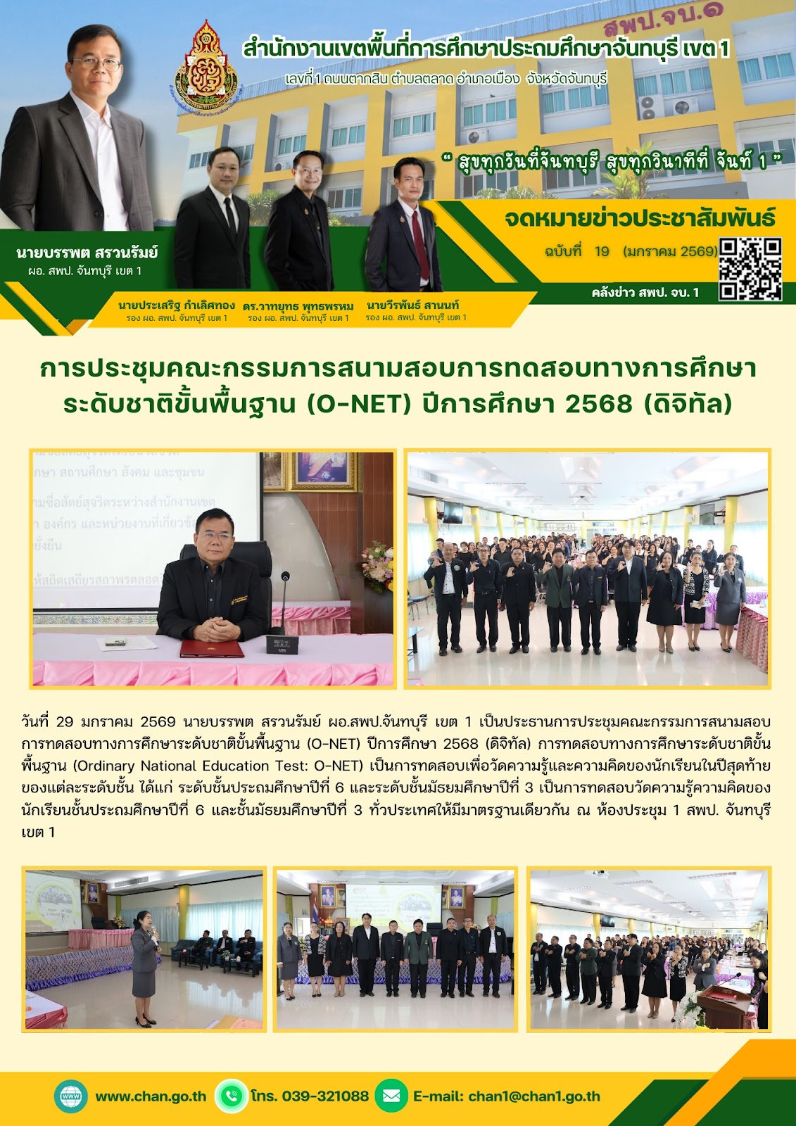 วันที่ 29 มกราคม 2569 นายบรรพต สรวมรัมย์ ผอ.สพป.จันทบรี เขต 1 เป็นประธานการประชุมคณะกรรมการสนามสอบการทดสอบทางการศึกษาระดับชาติขั้นพื้นฐาน (O-NET) ปิการศึกษา 2568 (ดิจิทัล) การทดสอบทางการศึกษาระดับชาติขั้นพื้นฐาน (Ordinary National Education Test: O-NET) เป็นการทดสอบเพื่อวัดความรู้และความคิดของนักเรียนในปีสุดท้ายของแต่ละระดับชั้น ได้แก่ ระดับชั้นประถมศึกษาปีที่ 6 และระดับชั้นมัรยมศึกษาปีที่ 3 เป็นการทดสอบวัดความรู้ความคิดของนักเรียนชั้นประถมศึกษาปีที่ 6 และชั้นมัรยมศึกษาปีที่ 3 ทั่วประเทศให้มีมาตรฐานเดียวกัน ณ ห้องประชุม 1 สพป. จันทบุรี เขต 1