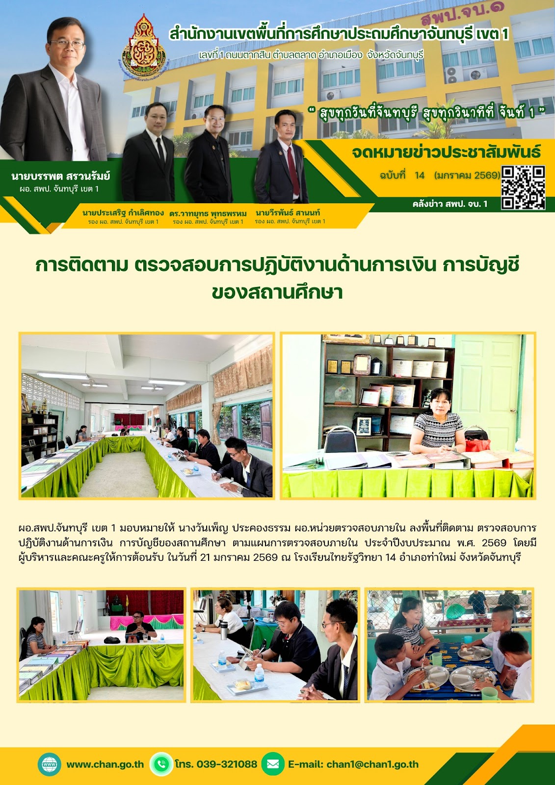 ทบุรี เขต 1 มอบหมายให้ นางวันเพ็ญ ประคองธรรม ผอ.หน่วยตรวจสอบภายใน ลงพื้นที่ติดตาม ตรวจสอบการปฏิบัติงานด้านการเงิน การบัญชีของสถานศึกษา ตามแผนการตรวจสอบภายใน ประจำปิ๊งบประมาณ พ.ศ.ศ. 2569 โดยมีผู้บริหารและคณะครู่ให้การต้อนรับ ในวันที่ 21 มกราคม 2569 ณ โรงเรียนไทยรัฐวิทยา 14 อำเภอท่าใหม่ จังหวัดจันทบุรี